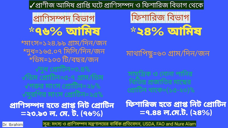 উপরের তথ্য থেকে আমরা যোগ করলেই মোট প্রাণিজ আমিষের যে চিত্র পাই, তা হচ্ছে মৎস্যখাত থেকে ৭.৪৫ লক্ষ মেট্রিক টন এবং প্রাণিসম্পদ খাত থেকে ২৩.৯৩ লক্ষ মেট্রিক টন। যা শতকরা হিসাবে মৎস্যখাতের জন্য ২৪ এবং প্রাণিসম্পদ খাতের জন্য ৭৬ শতাংশ হয়। এখানে উল্লেখ্য যে, কেউ কেউ হয়ত মৎস্য কিংবা প্রাণিসম্পদের উৎস সমূহ থেকে প্রাপ্ত আমিষের শতকরা হিসাবে ১-২% কম বেশী করতে পারেন কিন্তু তাতেও মোট শতাংশে বেশি পরিবর্তন হওয়ার কথা না।